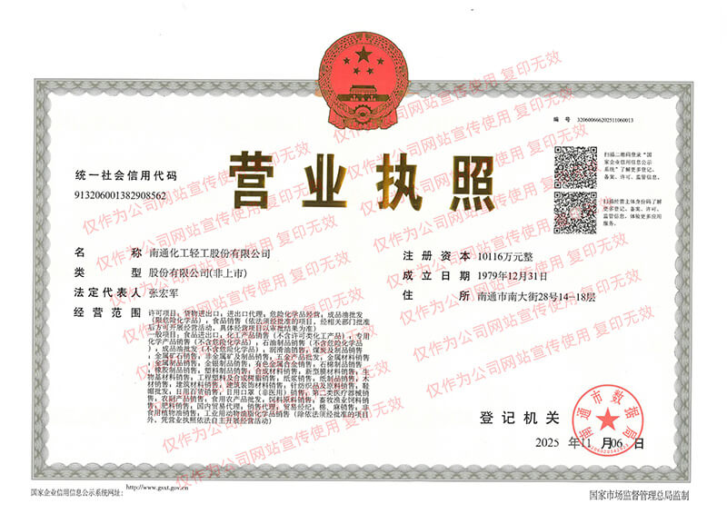 南通化工輕工股份有限公司成立于1963年7月1日, 1997年改制為股份有限公司,注冊資本10116萬元。公司自1963年成立以來,始終堅(jiān)持“誠信為本”的商信文化,向海內(nèi)外廣大供應(yīng)商按時足額履行付款、向廣大客戶按時按質(zhì)按量按價履行供貨、向金融機(jī)構(gòu)按時足額履行還款等,在商界享有很高聲譽(yù)。